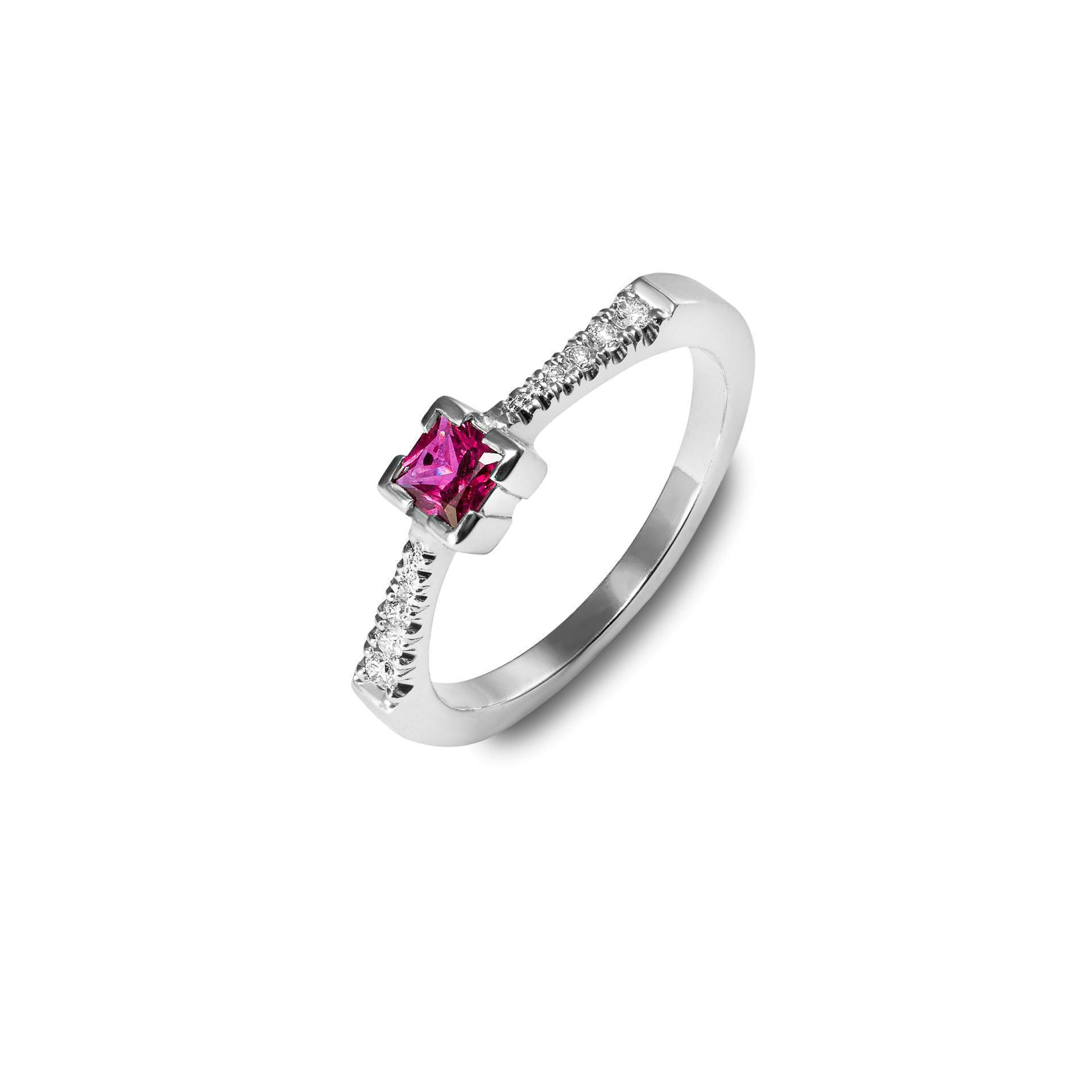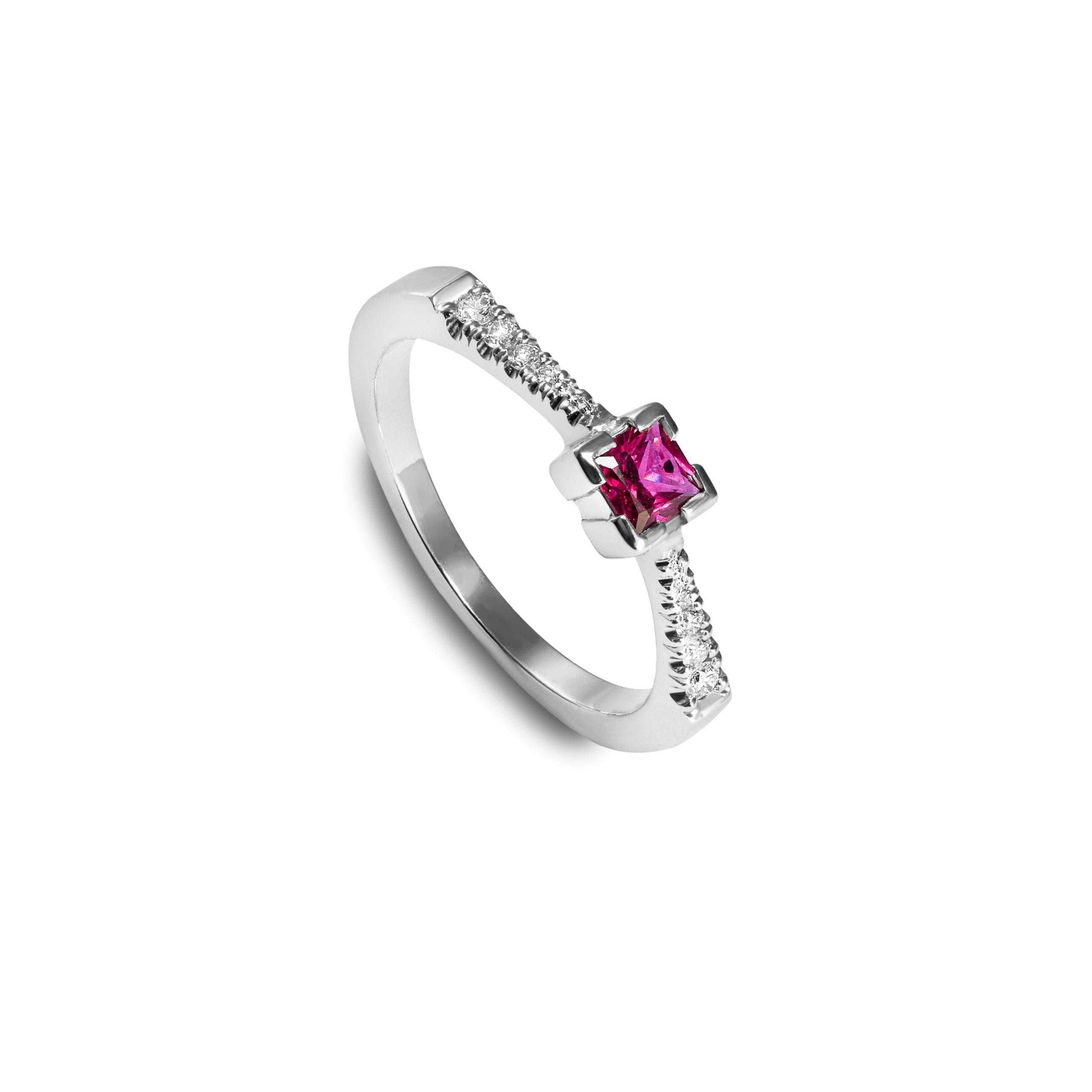 V prsteni je osadený dominantný prírodný štvorcový rubín: